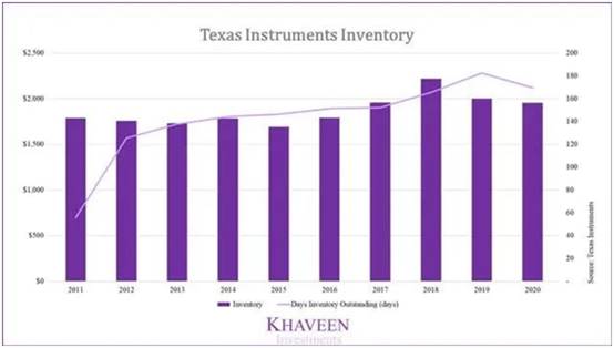 該公司的庫存水平在過去幾年中有所增長,未清庫存天數(shù)增加了169天,而2015年為146天。其2020年庫存占收入的百分比為13.5%,高于類似品牌的競爭對(duì)手設(shè)備占收入的百分比為9%,恩智浦為12%。因此,這為公司提供了堅(jiān)實(shí)的地位,可以利用緊張的供應(yīng)環(huán)境,高庫存水平和對(duì)供應(yīng)鏈的更好控制。
