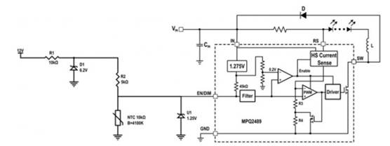 大多數(shù)汽車LED驅(qū)動(dòng)器都具有電流調(diào)光功能。但是,調(diào)光控制電路通常通過復(fù)雜的模擬或數(shù)字電路來控制,這在最終應(yīng)用中通常會(huì)占用大量空間,并增加整個(gè)系統(tǒng)成本。本文提出了一種基于NTC電阻(負(fù)溫度系數(shù))的簡單電路解決方案,該解決方案可根據(jù)溫度線性調(diào)節(jié)輸出電流。