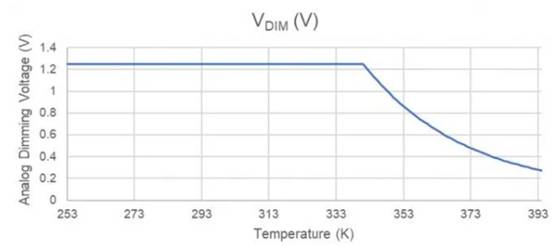 當(dāng)器件處于70°C或更低溫度時(shí),參考電壓提供的1.25V電壓會(huì)限制DIM輸入,并且LED會(huì)提供550 mA的電流。一旦溫度超過70°C閾值,電阻分壓器輸出就會(huì)降至1.25V以下。然后,DIM輸入遵循電阻分壓器配置文件,隨著溫度持續(xù)升高,這會(huì)減小LED驅(qū)動(dòng)電流。
