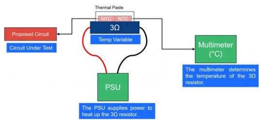 為了測(cè)試電路性能,構(gòu)建了一個(gè)系統(tǒng)來模擬現(xiàn)實(shí)世界的用例(圖4)。 一個(gè)3Ω電阻替代LED,該電阻通過在兩極之間施加電壓差來加熱。然后,選擇的NTC是用導(dǎo)熱膏固定在電阻器上,以確保最大程度地準(zhǔn)確地檢測(cè)電阻器/溫度。最后,NTC連接到設(shè)計(jì)的電路。通過改變電阻器的溫度(掃描提供給它的功率),獲得了DIM電壓曲線。
