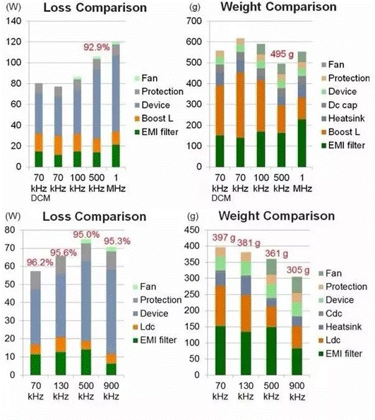 慎重選擇開關(guān)頻率,開關(guān)頻率會(huì)極大的影響整個(gè)變化器的功率密度,而且針對(duì)不同器件,拓?fù),最佳的開關(guān)頻率是變化的。