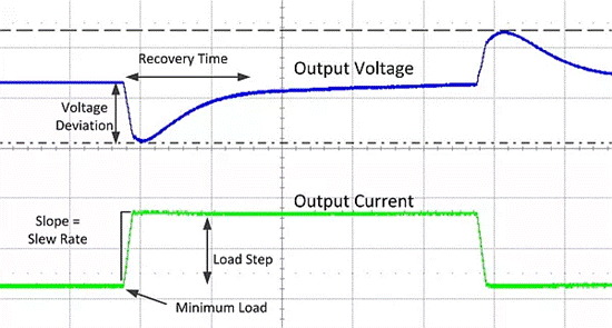 • 負載階躍的轉(zhuǎn)換速率(通常以安培每微秒為單位)