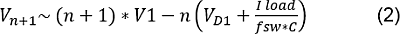 在公式(1)中,可以看出Vn+1很大程度上由n的倍數(shù)決定,但受到二級(jí)管正向壓降相關(guān)的“誤差項(xiàng)”和電荷泵轉(zhuǎn)換電容紋波電壓的影響,會(huì)有所減少。假設(shè)所有二極管都是相同類型的,那么它們的正向電壓等于: