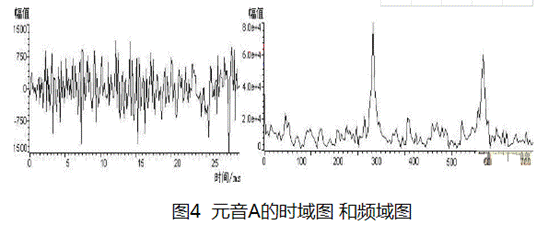 語音識(shí)別的基本原理是對(duì)語音信號(hào)進(jìn)行特征提取。目前常用的語音識(shí)別算法有基于模式匹配的動(dòng)態(tài)時(shí)間規(guī)正法(DTW: Dynamic Time Warping)、基于統(tǒng)計(jì)模型的隱馬爾柯夫模型法(HMM: Hidden Markov Model)以及基于神經(jīng)網(wǎng)絡(luò)的識(shí)別法(DNN、NPN、TDNN)等[7]。為便于系統(tǒng)應(yīng)用測試,本文采用一種最簡易的方法對(duì)系統(tǒng)進(jìn)行調(diào)試,即對(duì)英文元音的識(shí)別。基本原理是提取元音字母的頻率特征,各元音在其頻域響應(yīng)中都有三個(gè)明顯的共振峰頻率,而最容易識(shí)別的是第一共振峰,由此可進(jìn)行有效的元音識(shí)別。在提取第一共振峰頻率特征時(shí)采用“零交越”法(統(tǒng)計(jì)單幀信號(hào)波形穿越零點(diǎn)的次數(shù)——過零率),將信號(hào)頻率特征的分析轉(zhuǎn)換為時(shí)域分析,計(jì)算得到的過零率與理論值進(jìn)行比較即可實(shí)現(xiàn)元音的識(shí)別。圖4所示分別為元音“A”的時(shí)域和頻域圖。