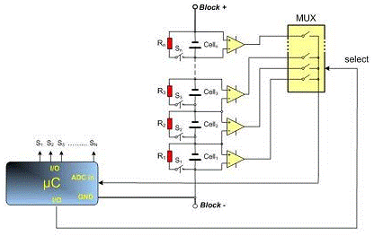為了對(duì)每個(gè)電池的荷電狀態(tài)進(jìn)行管理,每個(gè)電池的電壓都要加以測(cè)量。由于只有1號(hào)電池處于微控制器模數(shù)轉(zhuǎn)換范圍內(nèi),因此不能直接測(cè)量電池塊中其他電池的電壓。一種可能的方案是采用差分放大器陣列,但這需要保持整個(gè)電池塊的電壓水平。