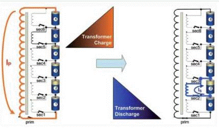 如果某個(gè)電池單元的電壓高于其他單元,那么就需要將其中的能量導(dǎo)出,這在充電模式下尤其必要。如果不進(jìn)行均衡,充電過程在第一塊電池單元充滿之后就不得不立即停止。均衡可以保持所有電池單元的電壓相等而避免發(fā)生過早停止充電的情況。圖2.1給出了頂部平衡模式下的能量流動(dòng)情況。在電壓掃描之后,發(fā)現(xiàn)電池單元5 是整個(gè)電池組中電壓最高的單元。此時(shí)閉合開關(guān)sec5,電流從電池流向變壓器。在開關(guān)sec5 斷開后閉合主開關(guān),此時(shí),變壓器就從儲(chǔ)能模式進(jìn)入了能量輸出模式。能量通過初級(jí)線圈送入整個(gè)電池組。