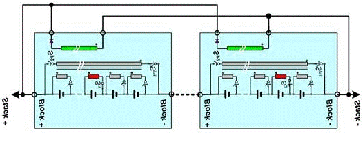 鋰電池儲(chǔ)能能力強(qiáng),但單個(gè)電池的電壓和電流都太低,不足以滿足混合動(dòng)力電機(jī)的需要。為增加電流需將多個(gè)電池并聯(lián)起來,為獲得更高的電壓,則要把多個(gè)電池串聯(lián)起來。單個(gè)鋰電池的電壓一般介于3.3~3.6V之間。例如,將多達(dá)12 個(gè)電池串聯(lián)組成一個(gè)電池塊(block)輸出電壓介于30~45V 之間,而混合動(dòng)力汽車驅(qū)動(dòng)需要336V左右的直流電源電壓,因此通常需要8-10個(gè)電池塊(block)串聯(lián)起來使用,意味著電動(dòng)汽車的電池組是數(shù)量眾多的的單體電池組成(100節(jié)以上)。