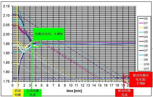 采用被動(dòng)均衡時(shí),用于電容容量和電容電壓成正比,采用固定電阻進(jìn)行被動(dòng)均衡時(shí),電壓曲線接近斜率固定的直線,圖中虛線為模擬被動(dòng)均衡時(shí)的電壓曲線。經(jīng)18分鐘的被動(dòng)均衡后,超級(jí)電容電壓趨于一致達(dá)到1.76V。