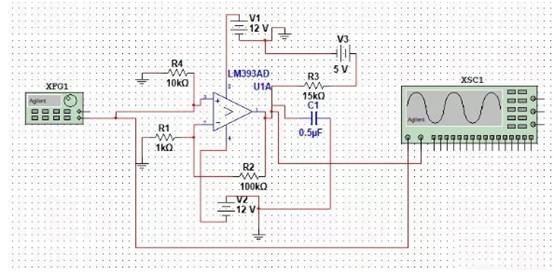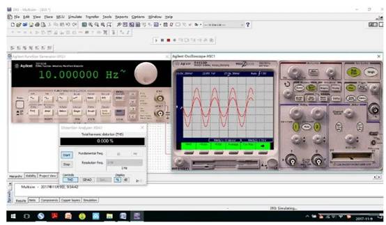 在Multisim軟件中建立圖2所示的仿真環(huán)境,用虛擬的安捷倫信號發(fā)生器和示波器觀察仿真結果。