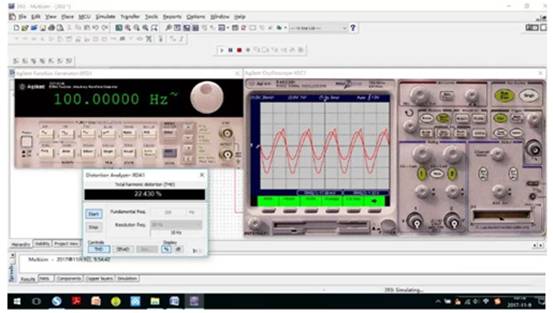 保持輸入信號幅度不變,頻率繼續(xù)增加到100Hz,此時輸出波形已經(jīng)嚴重失真,幅度也減小很多,有向三角波發(fā)展的趨勢,失真度高達22.430%。