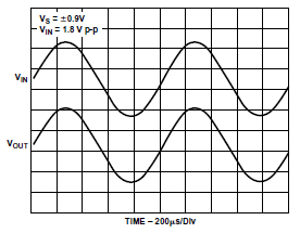 AD8517具有出色的軌到軌輸入和輸出特性,采用低至1.8 V的電源電壓供電。由于該放大器的電源電壓范圍設(shè)置為1.8 V,因此共模電壓可設(shè)置為1.8 V p-p,使輸出擺幅無(wú)需限幅便可達(dá)到任一電壓軌。圖1顯示的是在單位增益下測(cè)定的輸入和輸出范圍,頻率為22 kHz,VS = 1.8 V,VIN = 1.8 V p-p。