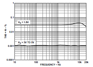 AD85x7系列的總諧波失真非常低,使該放大器成為音頻應(yīng)用的理想之選。圖2所示為T(mén)HD + N圖;在增益為1的同相增益配置下,VS> 3 V時(shí),THD + N約為0.001%,VS =1.8 V時(shí),THD + N約為0.03%。但在反相配置下,THD + N在所有額定工作電壓范圍內(nèi)均為0.001%。