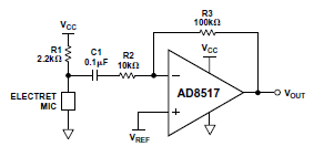 AD8517非常適合用作麥克風(fēng)前置放大器。圖4顯示了實(shí)現(xiàn)方法。放大器增益設(shè)置為R3/R2。R1用于偏置駐極體麥克風(fēng),C1用于阻隔放大器與直流電壓。