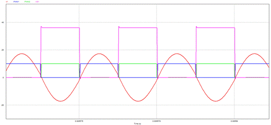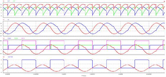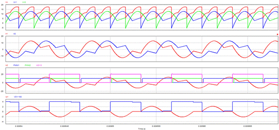 上述 圖中可以看出前級開關(guān)管均實(shí)現(xiàn)了ZVS,副邊實(shí)現(xiàn)了ZCS(圖4中情況除外),半橋相位關(guān)系如圖5所示。