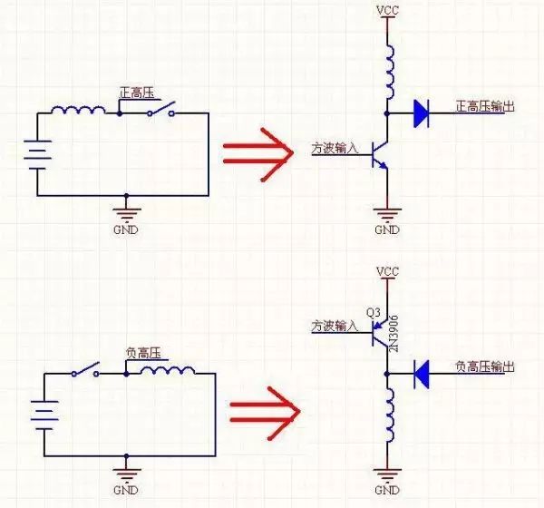 你可以清楚看到演變,電路中把開關(guān)換成了三極管,用固定頻率的方波控制三極管的開關(guān)就能實(shí)現(xiàn)升壓。不要小看這兩個(gè)圖,事實(shí)上,所有開關(guān)電源都是由這兩個(gè)圖組合變換而來(lái)的。
