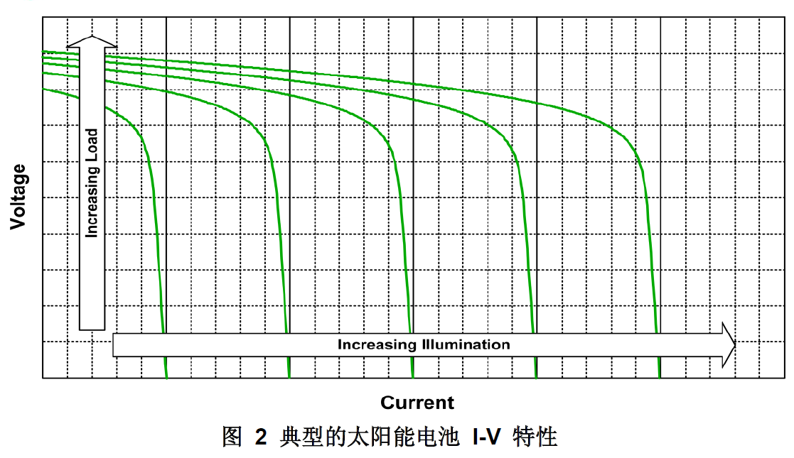 在大多數(shù)應(yīng)用中,人們都期望太陽能電池能提供盡可能多的電能。由于輸出功率是輸出電壓和電流的乘積,因此就必須確定電池工作區(qū)域中的哪一部分所產(chǎn)生的VI值最大。這一點被稱為最大功率點(MPP)。當(dāng)輸出電壓為其最大數(shù)值(VOC)時,輸出電流為零,這是一個極端情況;而當(dāng)輸出電流達(dá)到最大值(ISC),但輸出電壓為零時,則是另一種極端情況。在這兩種情況下VI的乘積均為零,因此,這兩種極端情況肯定都不是MMP點。我們可以很容易證明(或通過實驗進(jìn)行觀察),在任何應(yīng)用中,MPP一般會出現(xiàn)在太陽能電池輸出特性(請參見圖3)下半部分的某個位置。但問題是太陽能電池MPP的確切位置會因入射光線和環(huán)境溫度不同而變化。所以,設(shè)計旨在動態(tài)地調(diào)節(jié)太陽能電池的輸出電流,以達(dá)到太陽能電量生成系統(tǒng)的最大化,以便在實際應(yīng)用中其能夠在MPP點或者其臨近點工作。