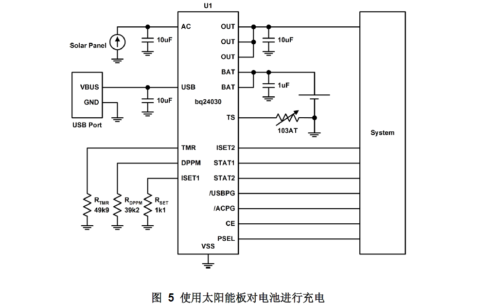 實施這一方案(最大功率點跟蹤器)的方法有很多,但都非常復(fù)雜,尤其是在衛(wèi)星等任務(wù)關(guān)鍵型系統(tǒng)中。然而,在很多小型應(yīng)用中,并不需要極其精確的MPP跟蹤方案,只需要一個能利用率約90%-95%可用電能的簡單低成本解決方案即可。TI線性充電控制器bqTINY-III系列的動態(tài)電源路徑管理(DPPM)功能就可用于諸如簡化MPP跟蹤器的實施。DPPM功能的主要原理如圖4所示。暫時忽略USB輸入,電路的工作原理如下:Q1對OUT引腳的電壓進(jìn)行調(diào)節(jié),Q2根據(jù)一個典型的CC-CV鋰離子充電曲線對充電電流進(jìn)行調(diào)節(jié)。如果連接至AC引腳的電源電流不足而無法為系統(tǒng)供電并為電池充電,則VOUT開始下降。如果VOUT達(dá)到了預(yù)定義的閾值VDPPM,bqTINY-III則會自動將充電電流降至一個可保持VDPPM時VOUT的水平。