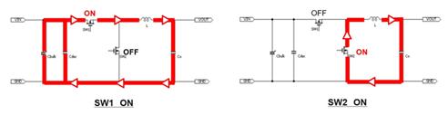 SW1為高邊開關(guān),SW2為低邊開關(guān)。SW1導(dǎo)通(SW2為OFF)時,電流路徑是從輸入電容器到SW1、再經(jīng)由電感L到輸出電容器。SW2導(dǎo)通(SW1為OFF)時,電流路徑是從SW2經(jīng)由L再到輸出電容器。下圖表示這些電流路徑的差分,每當(dāng)開關(guān)ON/OFF時,紅色線路的電流都會急劇變化。該環(huán)路的電流變化非常劇烈,所以會因PCB板布線電感而在環(huán)路內(nèi)會產(chǎn)生高頻振鈴。