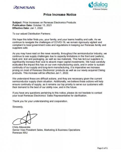 根據(jù)流傳的漲價函顯示,瑞薩此次漲價原因是前端代工、后端封測以及原材料產(chǎn)能限制,供應商大幅提高成本,為保持供應和制造的長期連續(xù)性,必須提高大部分產(chǎn)品以及新收購的 Dialog 產(chǎn)品定價。