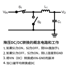 降壓DC/DC轉(zhuǎn)換是借著開關(guān)將DC電壓VIN做時間分割后以電感和電容器使其平滑化來轉(zhuǎn)換成所希望的DC電壓。降壓DC/DC轉(zhuǎn)換的概念電路和工作如右所示。