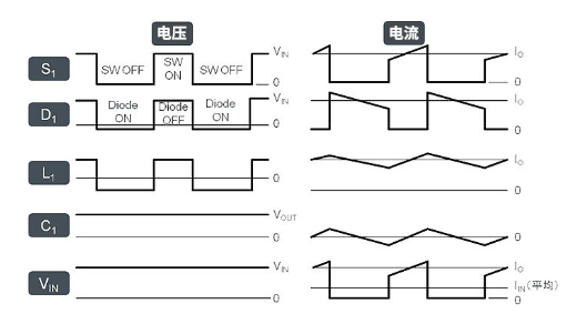 與基準(zhǔn)電壓進(jìn)行比較,檢查輸出電壓是否為設(shè)定電壓低于設(shè)定電壓時,開關(guān)變?yōu)镺N,從輸入向輸出供電。此時,電感會蓄積磁能,如果輸出電壓高于設(shè)定電壓,則開關(guān)OFF電感所蓄積的磁能變?yōu)殡娏鞅还┩敵鲐?fù)載,再返回電感電感的磁能消失,輸出電壓開始下降時,開關(guān)會再度為ON實(shí)際電流及電壓的開關(guān)波形也有記載。S1為MOSFET的開關(guān)晶體管、D1為肖特基二極管、L1為電感、C1為輸出電壓、VIN為輸入電壓。