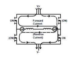 在連接到A相電機(jī)繞組端子的半橋中為頂部晶體管通電,將A相連接到V +。給連接到B相電機(jī)繞組端子的后半橋中的底部晶體管加電,會(huì)將B相連接到V-。這將完成A相繞組的電路,并迫使電流沿一個(gè)方向(正向)流過(guò)。關(guān)閉該對(duì)晶體管并打開(kāi)相反的一對(duì)晶體管將迫使電流以相反的方式(向后)通過(guò)繞組。參見(jiàn)圖2。
