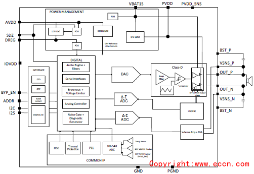 Y-Brige architecture improves overall efficiency at low level of output power and in idle mode. Integrated speakervoltage and current sense provides for real time monitoring of loudspeaker behavior. A supply tracking peakvoltage limiter optimizes amplifier eadroom. Brownout prevention scheme with multiple thresholds allowsreducing the gain in signal path when the supply drops.