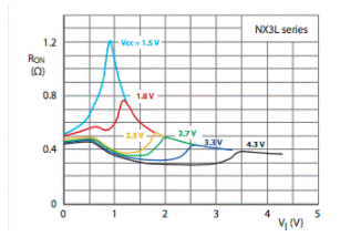 NX3L和NX3V器件的低導通電阻和低Ron平坦度的結合(請參見下面的曲線)極大地降低了開關信號的衰減和失真,從而消除了許多應用中對緩沖放大器的需求。