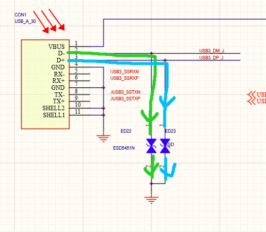 如上圖是我們在電路中最常見的處理靜電的防護(hù)電路,給接口器件添加esd進(jìn)行接地。