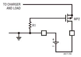 在此電路中,MP1 是反向電池檢測器件,MP2 是反向隔離器件。利用 MP1 的源極至柵極電壓來比較電池的正端子與電池充電器輸出。如果電池充電器端子電壓高于電池電壓,則 MP1 將停用主傳輸器件 MP2。因此,如果電池電壓被驅(qū)動至低于地電位,則顯然,檢測器件 MP1 將把傳輸器件 MP2 驅(qū)動至關(guān)斷狀態(tài) (將其柵極干擾至其源極)。不管電池充電器是使能并形成充電電壓還是停用 (0V),它都將完成上述操作。