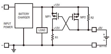 處理電源電壓反轉(zhuǎn)有幾種眾所周知的方法。最明顯的方法是在電源和負(fù)載之間連接一個二極管,但是由于二極管正向電壓的原因,這種做法會產(chǎn)生額外的功耗。雖然該方法很簡潔,但是二極管在便攜式或備份應(yīng)用中是不起作用的,因為電池在充電時必須吸收電流,而在不充電時則須供應(yīng)電流。