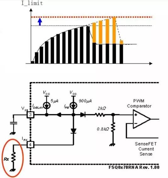 對(duì)這款FSQ0170RNA芯片,電感電流控制是以Vfb為參考電壓的,Vfb電壓的波形與電感電流的包絡(luò)成正比。控制Vfb的上升時(shí)間即可控制電感包絡(luò)的上升時(shí)間,即增加傳遞能量的時(shí)間。