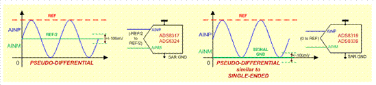 偽差分 SAR ADC 具有兩個輸入引腳,但被稱為“偽差分”,是因為在一個輸入保持為固定 DC 電壓(一般是 REF/2)而另一個輸入可接受動態(tài)變化的輸入信號時,可產(chǎn)生適當(dāng)?shù)?ADC 轉(zhuǎn)換。兩個輸入端 (AINP-AINM) 之間的差分信號隨后可轉(zhuǎn)換為數(shù)字代碼。通常為輸入變量提供 +/-100mV 的預(yù)留空間。圖 2 就是該輸入和一個獨特案例(其中固定輸入 (AINM) 可連接至信號接地,使其類似于單端輸入類型)。