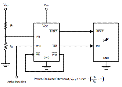 通常來講,受到連接到主電源的分壓器的驅(qū)動,電源失效比較器指示電源不斷下降。在主電源電壓下降到低于復(fù)位閾值之前,PFI的電壓低于VPFT幾毫秒,其會提前發(fā)出欠壓警報。 PFI引腳還可連接到MR引腳,以強制用于電壓檢測器的低輸出信號或用于監(jiān)控器/復(fù)位IC的復(fù)位。