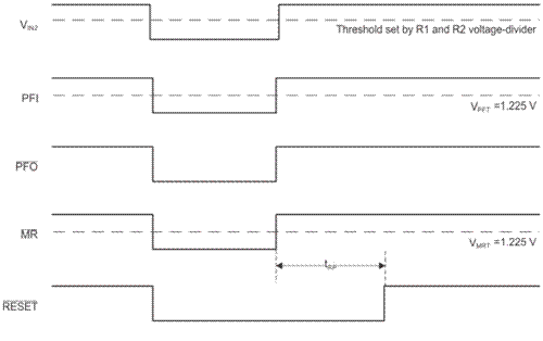 圖4中的時序圖所示為監(jiān)控第二電壓輸入(VIN2)的示例。當(dāng)連接到PFI引腳的VIN2變?yōu)榈碗娖綍r,PFO引腳下降為低電平,導(dǎo)致MR引腳下降到低電平,然后觸發(fā)復(fù)位。有多種方法可以使用電源故障和手動復(fù)位功能,因此可由您來決定您的應(yīng)用需求。