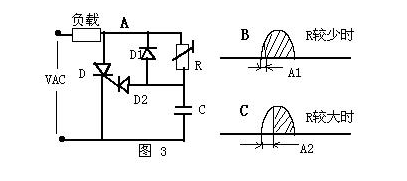 相位觸發(fā)電路實(shí)際上是交流觸發(fā)電路的一種,如圖3,這個(gè)電路的方法是利用RC回路控制觸發(fā)信號(hào)的相位。當(dāng)R值較少時(shí),RC時(shí)間常數(shù)較少,觸發(fā)信號(hào)的相移A1較少,因此負(fù)載獲得較大的電功率;當(dāng)R值較大時(shí),RC時(shí)間常數(shù)較大,觸發(fā)信號(hào)的相移A2較大,因此負(fù)載獲得較少的電功率。這個(gè)典型的電功率無(wú)級(jí)調(diào)整電路在日常生活中有很多電氣產(chǎn)品中都應(yīng)用它。