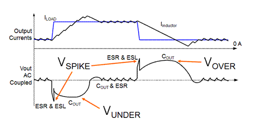 如下文圖5-6所示,電容的輸出電壓過沖、下沖和峰-峰電壓紋波計(jì)算值可用于確定電容。