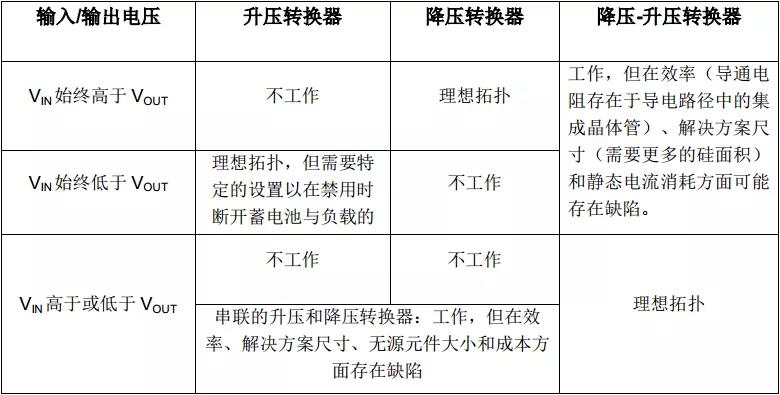 由于降壓-升壓轉(zhuǎn)換器“包含”一個降壓轉(zhuǎn)換器和一個升壓轉(zhuǎn)換器,可以用它來進行DC/DC電壓轉(zhuǎn)換。所以從這個角度來說,答案是肯定的。但仍需考慮更多細節(jié)。表1說明了給定的輸入電壓范圍與所需的輸出電壓,以及降壓轉(zhuǎn)換器、升壓轉(zhuǎn)換器或降壓-升壓轉(zhuǎn)換器能否成為出色的解決方案。