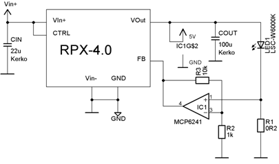 如果 LED 由電壓源供電,它們需要串聯(lián)電阻來限制電流和調(diào)整工作點(diǎn),產(chǎn)生額外的功率損耗。如果使用電流源來為 LED 供電則可以避免這種情況。使用穩(wěn)壓器和運(yùn)算放大器可以實(shí)現(xiàn)簡單的電路,對 LED來說具有電流源特性: