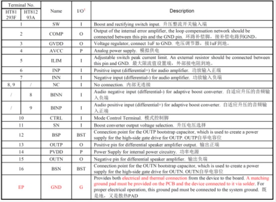 HT81293的最大特點是防削頂失真(ACF)輸出控制功能,可檢測并抑制由于輸入音樂、語音信號幅度過大所引起的輸出信號削頂失真(破音),也能自適應地防止在BOOST升壓電壓下降所造成的輸出削頂,顯著提高音質(zhì),創(chuàng)造非常舒適的聽音享受,并保護揚聲器免受過載損壞。HT81293提供兩種不同音樂體驗的ACF模式,以及ACF-Off模式。 HT81293具有先進的擴頻功能來抑制EMI。 HT81293的增益為32dB。此外,HT81293集成了輸出端過流保護、片內(nèi)過溫保護、升壓過壓保護等功能。