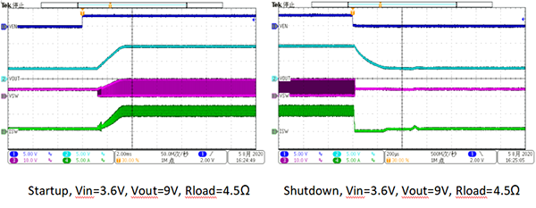 Startup, Vin=3.6V, Vout=9V, Rload=4.5Ω         Shutdown, Vin=3.6V, Vout=9V, Rload=4.5Ω