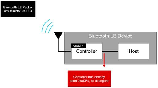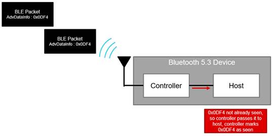 使用周期性廣告的BLE設(shè)備通常會(huì)多次發(fā)送信息,以增加傳輸?shù)亩鄻有圆⑻岣邟呙柙O(shè)備正確解碼的可能性。因此,偵聽器設(shè)備可能會(huì)接收到同一分組的多個(gè)副本,并且會(huì)浪費(fèi)功率多次解碼同一信息。