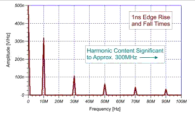 您可以將某個數(shù)字信號的頻譜成分簡化為其頻率和升時間。時鐘或者系統(tǒng)頻率建立電路的時間基準,但其邊緣率形成干擾諧波。圖 1 顯示了一個 10 MHz 方波的頻譜成分。該 10 MHz 信號的邊緣率為 10 ns。請注意,圖 1 中這些諧波的量級隨頻率降低。一般而言,這種信號的潛在 EMI 為: