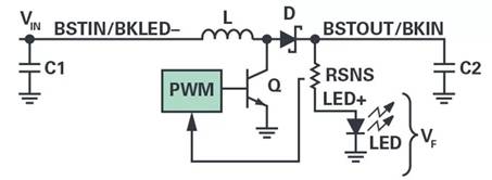 降壓拓撲用于相對較高的輸入電壓,如汽車和工業(yè)24 V電源軌。圖3顯示了 VIN > VF配置的方框圖。輸入電壓連接到BSTOUT/BKIN終端,LED陰極連接到BSTIN/BKLED–終端。當晶體管Q導通時,電流從輸入端流過LED燈串和電感L直到GND。一旦Q關斷,L上的電壓就會改變極性,二極管D會正偏,從而將LED陰極拉到輸入電壓電平以下,在LED燈串中提供設定的電流值。C5為該拓撲創(chuàng)建輸出濾波器。