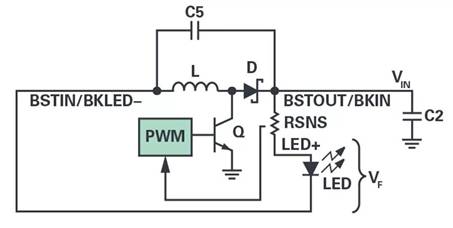 在許多商用電池和太陽能供電應用中,輸入電壓變化范圍很廣。在這些情況下,最合適使用圖4所示的降壓-升壓拓撲。輸入電壓和LED陰極連接到BSTIN/BKLED–終端。當晶體管Q導通時,電流在電感L中積聚。一旦Q關斷,L上的電壓就會改變極性,使二極管D正偏,同時電壓攀升超過輸入電平。PWM使流經(jīng) LED和C5的電流保持在設定值不變,C2充當輸出濾波器。LED燈串電壓 VF 可以低于或高于 VIN。