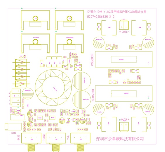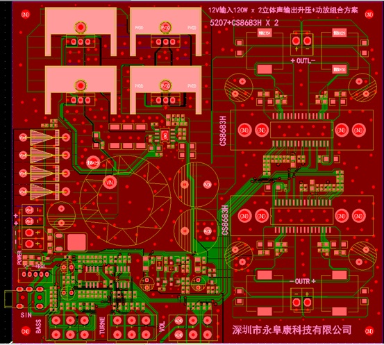 2、采用CS8683兩顆大功率單聲道D類音頻功放IC(單聲道100W用一顆),30V提供2*100W/4歐 ( THD+N=1%)持續(xù)功率輸出;