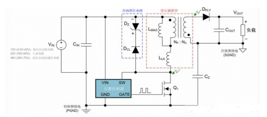 圖 1:采用典型的 24V 電源或 12V/48V 輸入(分別用于工業(yè)或汽車電池應(yīng)用)的 DC-DC 反激式穩(wěn)壓器。圖中已明確標(biāo)出具有磁化作用的反激式變壓器、漏電感以及電路寄生電容