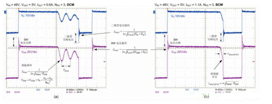 圖 2 所示為以非連續(xù)模式 (DCM) 和邊界導(dǎo)通模式 (BCM) 運(yùn)行的反激式功率級(如圖 1 所示)的初級側(cè) MOSFET 和次級側(cè)整流二極管電壓波形[8]。圖 2a 突出顯示了 DCM 模式下的開關(guān)波形,其中初級側(cè) MOSFET 在開關(guān)節(jié)點(diǎn)諧振電壓擺幅的谷值附近導(dǎo)通。圖 2b 所示為 BCM 開關(guān)波形,其中準(zhǔn)諧振 MOSFET 在從二次側(cè)繞組電流衰減到零起約半個諧振周期延遲之后導(dǎo)通。在 DCM 和 BCM 模式下,初級側(cè) MOSFET 均在零電流時導(dǎo)通。