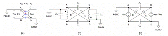 圖 4.(a) 用于 CM 噪聲分析的雙繞組變壓器;(b) 六電容 CM 模型;(c) 四電容 CM 模型。