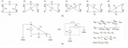 圖 4a 所示為雙繞組變壓器,初級側(cè)端子和次級側(cè)端子分別由(A、B)和(C、D)表示。端子 A 根據(jù)輸入總線電容等效連接到 PGND,在 CM 噪聲分析的適用頻率下表現(xiàn)為有效短路。圖 4b 顯示的是變壓器的傳統(tǒng)靜電模型。從節(jié)能角度來看,可建立包含六個電容的雙繞組變壓器的寄生電容模型,其中包括四個繞組間電容(C1、C2、C3、C4)和兩個繞組內(nèi)電容(CP、CS)。